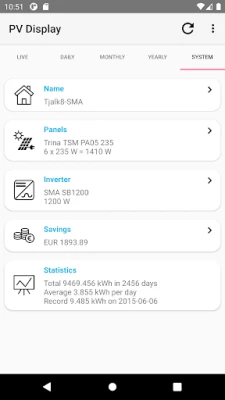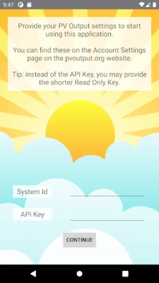 Get started: * Find your API Key and System ID on pvoutput.org - Settings - API Settings * Enter these values in the settings screen of PV Display * Start flipping through your live and historical solar panel data